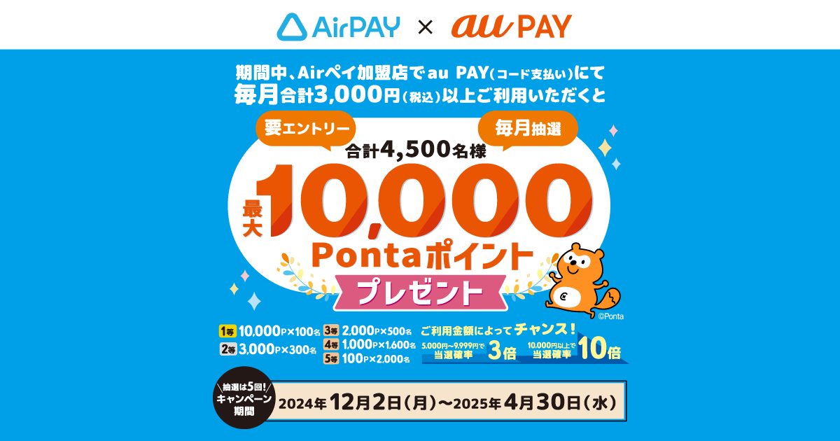 Airペイ加盟店にてau PAY(コード支払い)を利用してお買い物いただくと、毎月抽選でPontaポイントがあたるキャンペーンを実施!キャンペーン期間:2024年12月2日~2025年4月30日