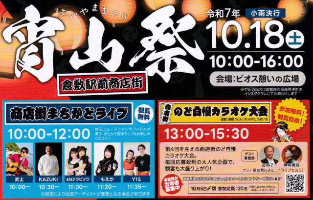 2025年10月18日は倉敷センター街商店街の「ビオスいこいの広場」で、秋祭りのイベントとして「倉敷商店街・宵山祭(よいやままつり)」が開催されます!
