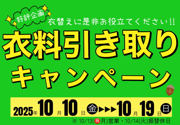 - 10/10~19は「子供服・婦人服衣料品引き取りキャンペーン」! 2025年10月8日