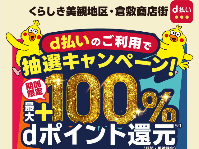 キャンペーン期間中に、くらしき美観地区・倉敷商店街のキャンペーン対象店舗にてd払いでお支払いされたお客様に対して、抽選で引いた等数に応じたdポイント(期間・用途限定)を進呈いたします。