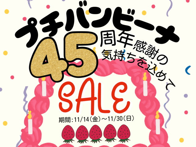 2025年11月14日~ 30日の期間中、当店プチバンビーナの45周年記念企画と致しまして「45周年記念SALE」を開催致します♪