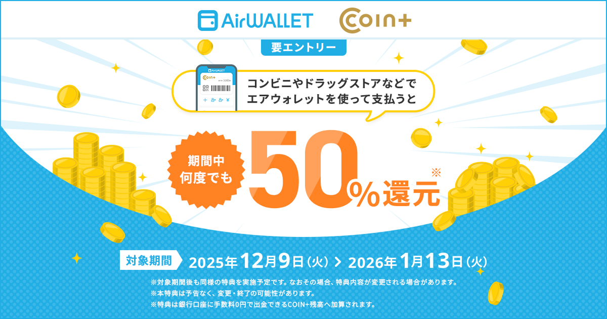 2025年12月9日~2026年1月13日の期間中、「Airペイ(AirPAY)」経由でご利用可能な「COIN+(コインプラス)」のキャンペーンにエントリー後、対象店舗での決済が還元上限に達するまで「50%還元」で「最大1,000円分」が「COIN+残高」に戻ってくるキャンペーンを開催!