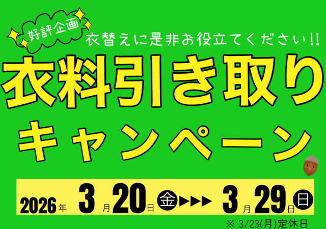 - 3/20~29は「子供服・婦人服衣料品引き取りキャンペーン」! 2026年3月18日