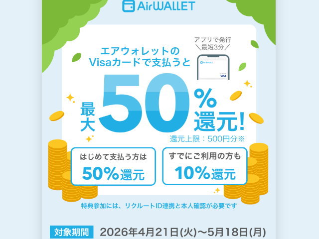 【最大50%還元】エアウォレットのVisaカードで誰でもお得にお買い物! | リクルートID・ポイント公式サイト