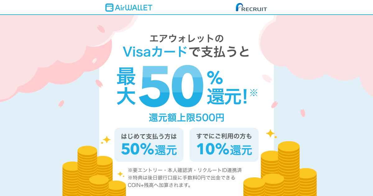 エアウォレットのVisaカードでのお支払いで、初めての方は50%、すでにご利用の方も10%COIN+残高を還元!(上限500円分まで)