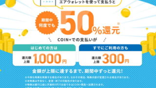 2025年12月9日~2026年1月13日の期間中、「Airペイ(AirPAY)」経由でご利用可能な「COIN+(コインプラス)」のキャンペーンにエントリー後、対象店舗での決済が還元上限に達するまで「50%還元」で「最大1,000円分」が「...
